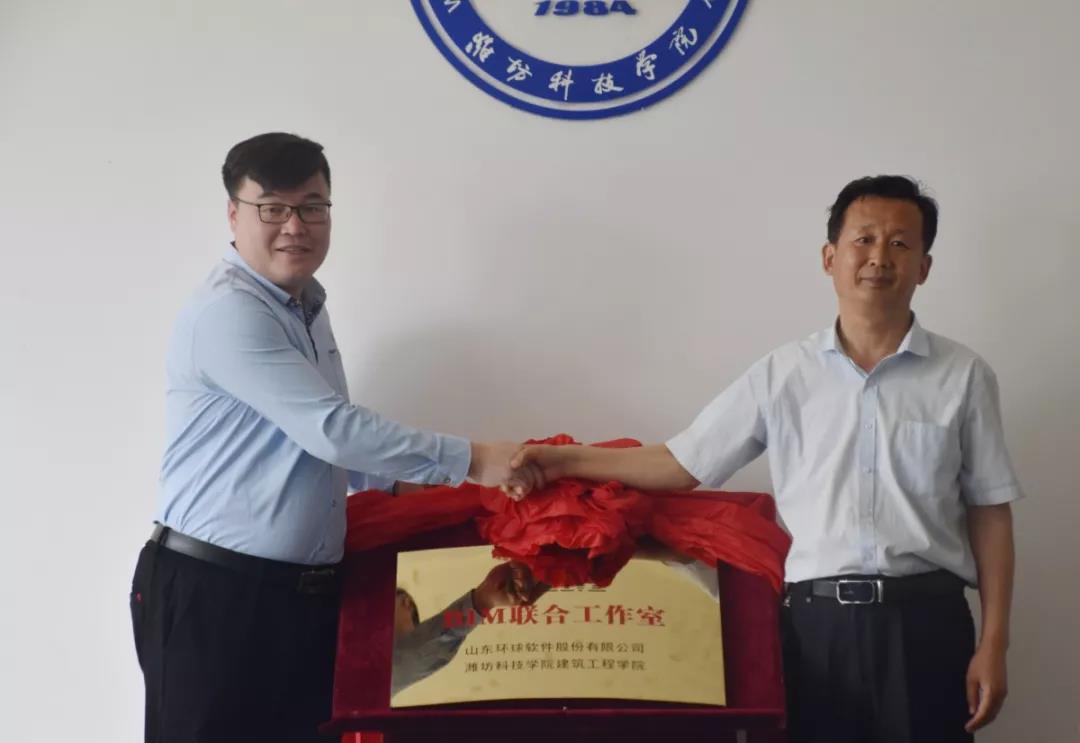 濰坊科技學(xué)院副院長寇興亭與環(huán)球軟件聯(lián)席總裁張立偉為“BIM聯(lián)合工作室”揭牌