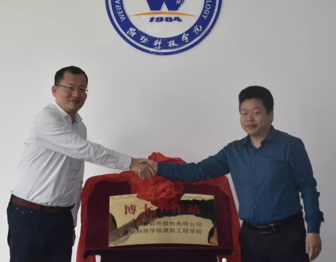 濰坊科技學(xué)院校企合作與就業(yè)管理辦公室就業(yè)指導(dǎo)中心主任范福強與環(huán)球軟件聯(lián)席總裁陳艷章為“博士工作站”揭牌