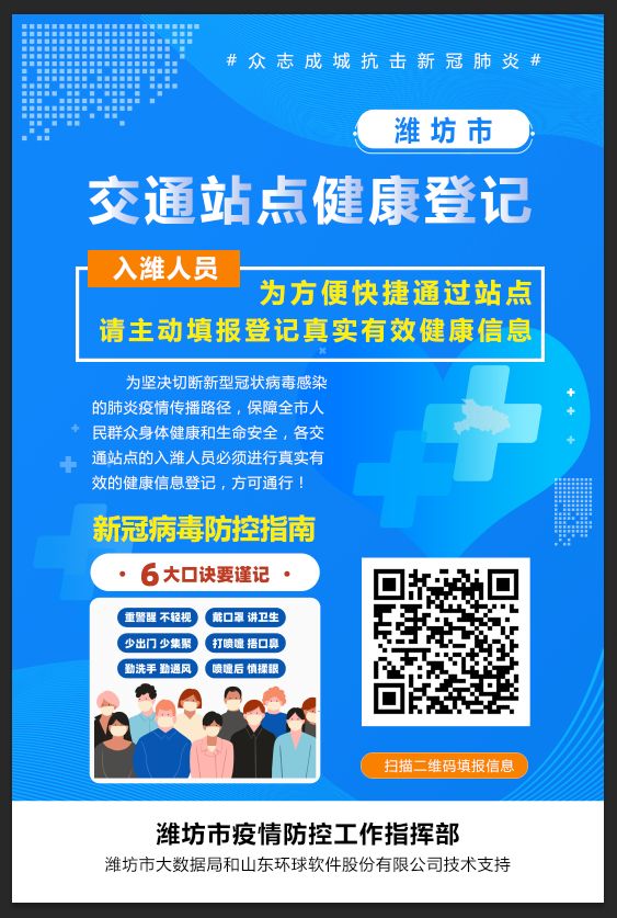 同時,濰坊市疫情防控工作指揮部委托環(huán)球軟件研發(fā)了交通站點健康登記系統(tǒng),這個系統(tǒng)針對通過火車站、汽車站、機場等交通站點入濰人員進行登記。入濰人員掃描二維碼,進入系統(tǒng)填寫個人健康信息。交通站點健康登記系統(tǒng)進一步加強入濰人員管理,有效配合相關部門進行防疫檢查,方便人員安全出行,減少交叉感染風險。