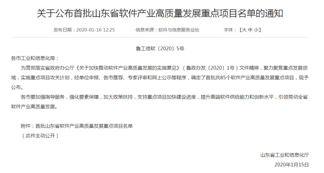 2020年1月16日,山東省工業(yè)和信息化廳公布“首批山東省軟件產(chǎn)業(yè)高質(zhì)量發(fā)展重點項目”名單,由環(huán)球軟件自主研發(fā)的區(qū)域人口健康信息平臺成功通過認定。