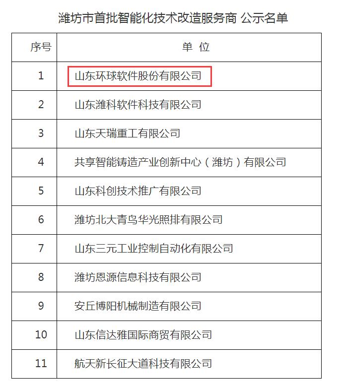 2020年12月3日,濰坊市工業(yè)和信息化局發(fā)布“關于擬認定濰坊市首批智能化技術改造服務商的公示”名單,環(huán)球軟件被認定為濰坊市首批智能化技術改造服務商。