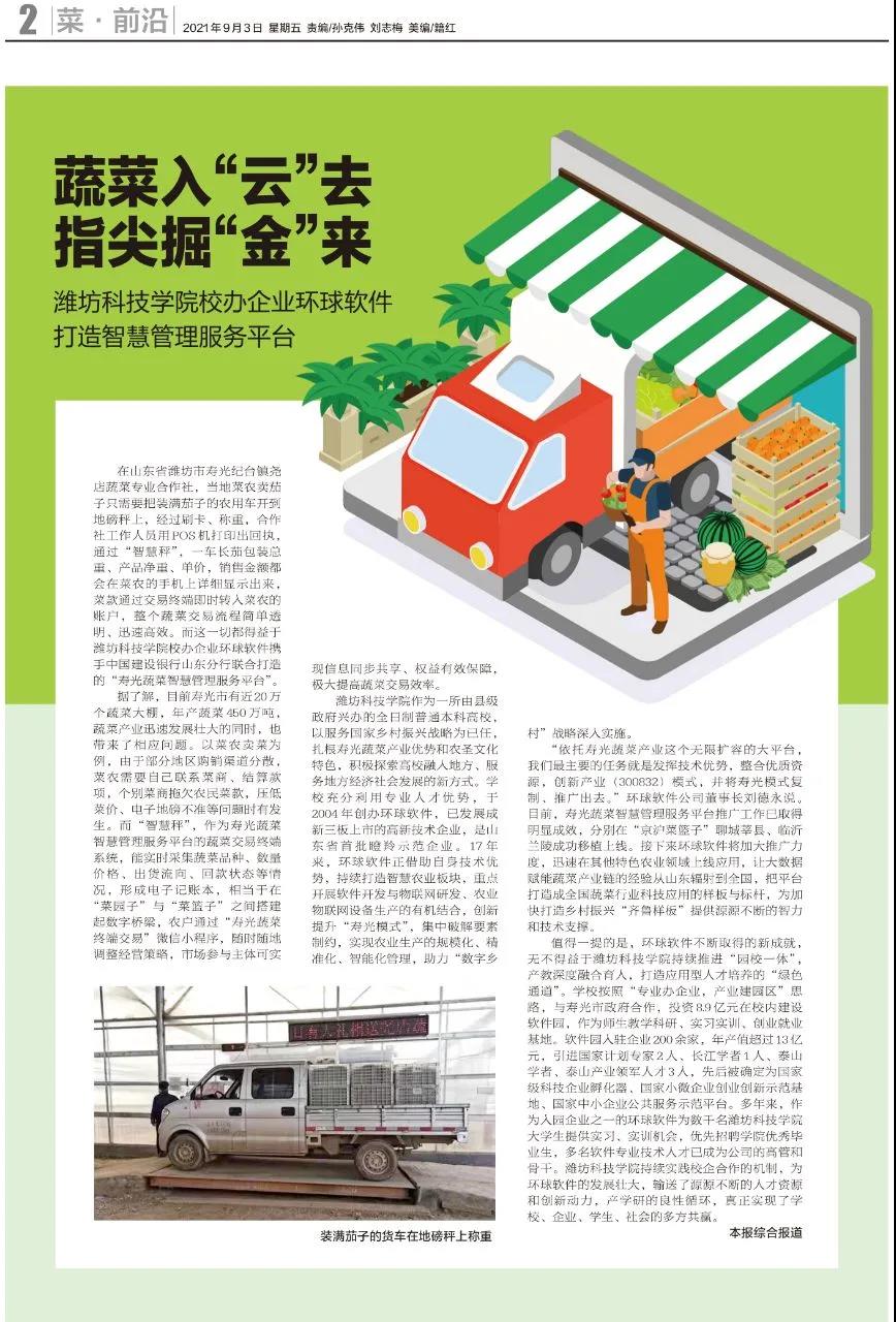 濰坊科技學(xué)院作為一所由縣級政府興辦的全日制普通本科高校,以服務(wù)國家鄉(xiāng)村振興戰(zhàn)略為已任,扎根壽光蔬菜產(chǎn)業(yè)優(yōu)勢和農(nóng)圣文化特色,積極探索高校融入地方、服務(wù)地方經(jīng)濟社會發(fā)展的新方式。學(xué)校充分利用專業(yè)人才優(yōu)勢,于2004年創(chuàng)辦環(huán)球軟件,已發(fā)展成新三板上市的高新技術(shù)企業(yè),是山東省首批瞪羚示范企業(yè)。17年來,環(huán)球軟件正借助自身技術(shù)優(yōu)勢,持續(xù)打造智慧農(nóng)業(yè)板塊,重點開展軟件開發(fā)與物聯(lián)網(wǎng)研發(fā)、農(nóng)業(yè)物聯(lián)網(wǎng)設(shè)備生產(chǎn)的有機結(jié)合,創(chuàng)新提升“壽光模式”,集中破解要素制約,實現(xiàn)農(nóng)業(yè)生產(chǎn)的規(guī)?;⒕珳驶?、智能化管理,助力“數(shù)字鄉(xiāng)村”戰(zhàn)略深入實施?!耙劳袎酃馐卟水a(chǎn)業(yè)這個無限擴容的大平臺,我們最主要的任務(wù)就是發(fā)揮技術(shù)優(yōu)勢,整合優(yōu)質(zhì)資源,創(chuàng)新產(chǎn)業(yè)(300832)模式,并將壽光模式復(fù)制、推廣出去?!杯h(huán)球軟件公司董事長劉德永說。目前,壽光蔬菜智慧管理服務(wù)平臺推廣工作已取得明顯成效,分別在“京滬菜籃子”聊城萃縣、臨沂蘭陵成功移植上線。接下來環(huán)球軟件將加大推廣力度,迅速在其他特色農(nóng)業(yè)領(lǐng)域上線應(yīng)用,讓大數(shù)據(jù)賦能蔬菜產(chǎn)業(yè)鏈的經(jīng)驗從山東輻射到全國,把平臺打造成全國蔬菜行業(yè)科技應(yīng)用的樣板與標桿,為加快打造鄉(xiāng)村振興“齊魯樣板”提供源源不斷的智力和技術(shù)支撐。